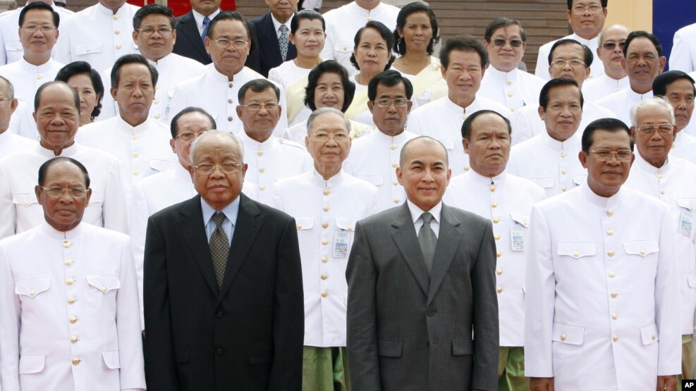 Cambodia's King Norodom Sihamoni, second right, poses for photograph altogether with Hun Sen, right, Cambodian Prime Minister, Chea Sim, second left, Cambodia Senate President, Heng Samrin, left, Cambodian National Assembly President, in front of the National Assembly in Phnom Penh, Cambodia, Wednesday, Sept. 24, 2008. Cambodia's newly elected lower house of parliament held its inaugural session Wednesday, ushering in a new era of sweeping power of Prime Minister Hun Sen's ruling party in the impoverished Southeast Asian nation. (AP Photo/Heng Sinith)