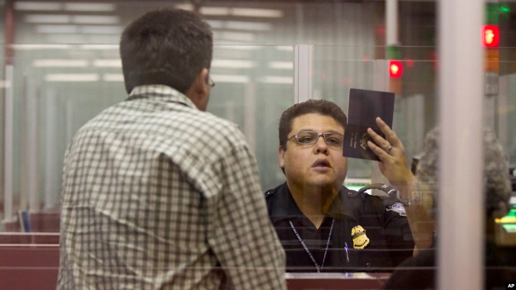 FILE - A Customs and Border Protection officer checks the passport of a non-resident visitor to the United States at McCarran International Airport, Dec. 13, 2011, in Las Vegas.