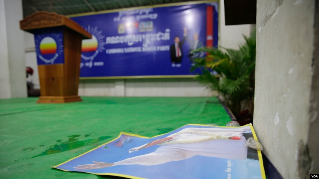 រូបឯកសារ៖ រូបថតលោក កឹម សុខា ត្រូវបានទុកលើឆាកធ្វើសន្និសីទកាសែតនៅទីស្នាក់ការគណបក្សសង្គ្រោះជាតិ កាលពីល្ងាចថ្ងៃទី៤ ខែមិថុនា ឆ្នាំ២០១៧ ថ្ងៃបោះឆ្នោតជ្រើសរើសក្រុមប្រឹក្សាឃុំសង្កាត់។ (អូន ឆេងប៉រ/VOA)