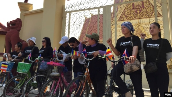 រូបឯកសារ៖ សកម្មជនដីធ្លីតំបន់បឹងកក់ និងអ្នកស្រី ទេព វណ្ណី ប្រមូលផ្តុំនៅពីក្រោមក្លោងទ្វារចូលទៅក្នុងតុលាការកំពូល កាលពីព្រឹកថ្ងៃពុធ ទី២ ខែមីនា ឆ្នាំ២០១៦។ (ហ៊ុល រស្មី/VOA)