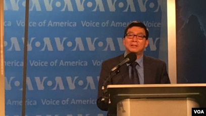 លោក ជុន ច័ន្ទបុត្រ ថ្លែងនៅក្នុងពិធីប្រគល់និងទទួលពានរង្វាន់ David Burke Awards នៅទីស្នាក់ការកណ្តាលរបស់ VOA ក្នុងរដ្ឋធានីវ៉ាស៊ីនតោន កាលពីថ្ងៃទី១ ខែធ្នូឆ្នាំ២០១៦។ (សាយ មុន្នី/VOA)