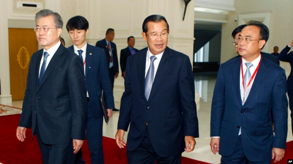 FILE - Cambodia's Prime Minister Hun Sen, center, walks together with South Korea President Moon Jae-in, left, as Cambodian tycoon Kith Meng, right, accompanies them before a business forum at the Peace Palace, in Phnom Penh, Cambodia, March 15, 2019.